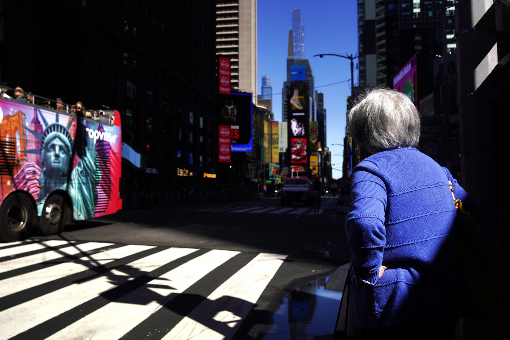 10月1日,在美国纽约曼哈顿的时报广场附近,行人等待通过人行横道斑马线过马路。新华社记者吴晓凌摄